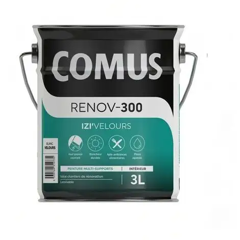PROPRIÉTÉS ET AVANTAGES IZI’VELOURS est une peinture d’aspect velours en phase aqueuse permettant de réaliser des finitions soignées de type B. Elle est destinée à la protection et la décoration des murs. plafonds et boiseries. on jaunissante et couvrante. au grain fin et régulier. Parfaitement adaptée à la finition des revêtements muraux type toile de verre. Lessivable (classe 1 selon EN13300) et chimiquement inerte. Excellente résistance aux produits courants de nettoyage et de désinfection. Particulièrement recommandée dans une démarche HACCP. Classement de réaction au feu M1(sur support inerte ou M0 selon l’arrêté du 21/11/2002) SUPPORTS Murs en plâtre. bois* et agglomérés de bois. plaques de plâtre cartonnées. enduit ciment préalablement préparés. TEINTE ET ASPECT Aspect : Velours Coloris : Blanc CONDITIONNEMENT 1L. 3L et 15L RENDEMENT 10 à 12m² / Litre *Certaines essences de bois (bruts ou reconstituées) peuvent provoquer des taches. Faire un essai préalable ou utiliser le primaire adapté.